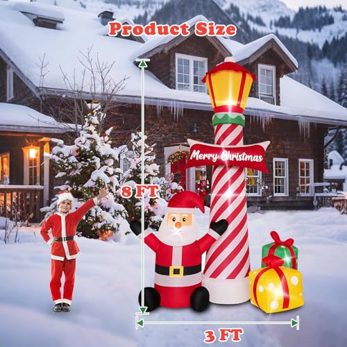 Decoraciones navideñas inflables de 8 pies para exteriores, Papá Noel gigante que está de pie debajo del faro con caja de regalo, inflable con luces LED integradas para fiestas, exteriores, jardín
